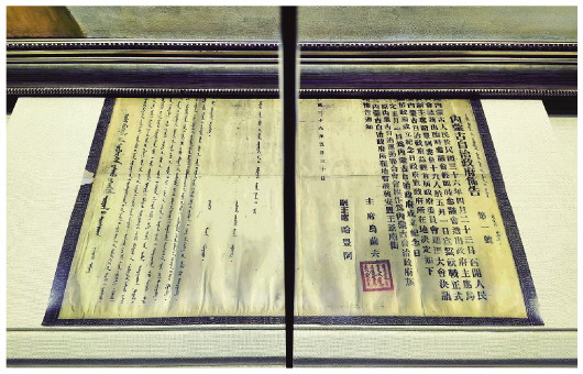在乌兰浩特市内蒙古民族解放纪念馆中,展示着内蒙古自治政府成立后发布的相关文件。 本报记者达日罕摄