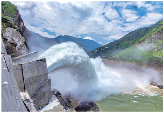 正在进行试验性泄洪的白鹤滩水电站1号泄洪洞(9月2日摄)。白鹤滩水电站泄洪洞工程日前启动试验性泄洪,为后续工程安全度汛奠定了基础。 新华社发(谢雷摄)