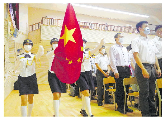 9月1日,在香港教育工作者联会黄楚标中学,护旗升旗小队正步走向旗杆。