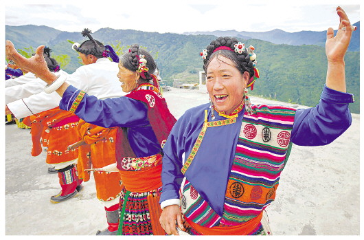 “我们在这间屋里唱歌,唱的是先辈们传下来的歌……”半山腰一块水泥坝子上,49岁的村民泽英俊与另外十几名村民身着氆氇靴子、氆氇巾、氆氇裙,手持龙碗等道具,载歌载舞,纵情演唱阿尔麦多声部民歌。