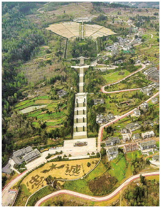 位于四川省巴中市通江县王坪村的川陕革命根据地红军烈士陵园和王坪村新貌 (二〇二一年三月一日航拍)。