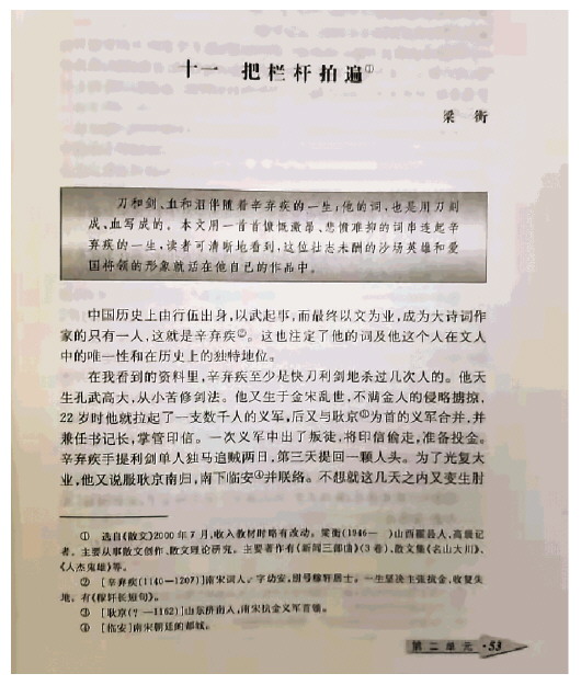 为辛弃疾所打动的绝不止我一人。这篇作品的效果也远远溢出了课堂。一般来说,因为要应付考试,学生总把课文当负担。但是很多学生却爱上了这篇课文。华东师大二附中的一位同学谈她初读本文时的感觉:“回想起来读梁先生的文章不算早,大约是在高一,陆续读了一些。当时的初衷只是为了解书中的历史名人。但不曾想,只一篇《把栏杆拍遍》便使我沉醉了,不能释手。”河南一位军人在《新华文摘》上见到本文,激动地批满版面的边边角角,他把刊物给我复印寄来,说:“感谢作者为我们武人立传,写了一篇好文章。”我的一个老乡是一位英语教师,语文教学本与她无关,看了学生的书本后激动地写了一篇读后感,还组织了读书会。说明文章已到达人心深处。