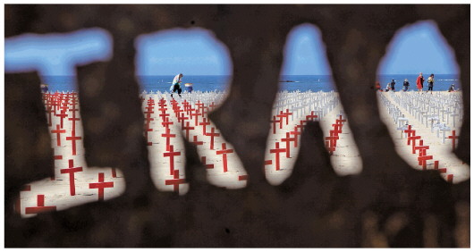 2012年4月16日,透过“伊拉克”字样的反战标牌拍摄的美国“西阿灵顿公墓”。