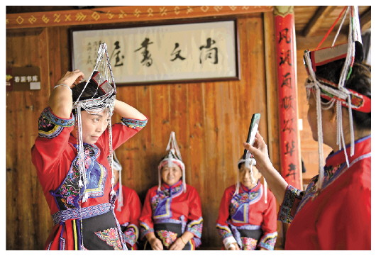 九月七日,在浙江景宁畲族自治县红星街道岗石村,新时代畲歌队成员在穿戴传统服饰。新华社记者翁忻旸摄 |