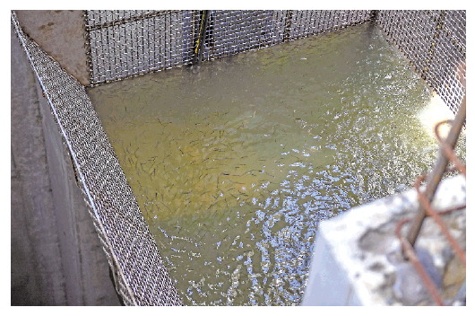 小图(左):集鱼斗将鱼类从丰满水电站大坝鱼道内提升起来。 新华社记者张楠摄