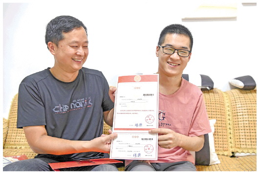 郑宇宸(右)和父亲在家里展示厦门大学的录取通知书(8月18日摄)。 本报记者周华摄 |