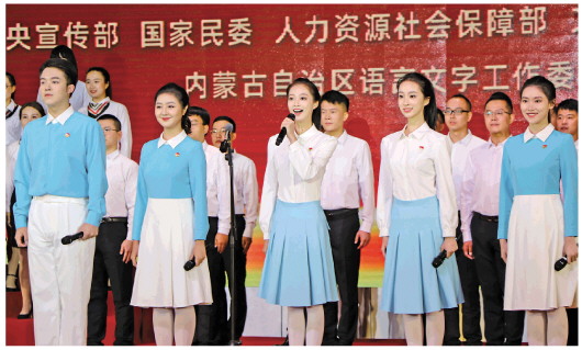 9月14日,来自中国传媒大学、内蒙古大学的学生代表和鄂尔多斯市群众代表在全国推普周开幕式上朗诵《读中国》。新华社记者朱文哲摄