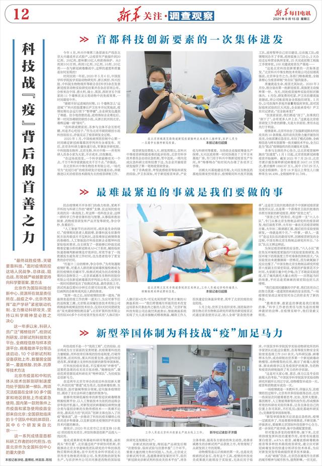 “这是北京科技创新要素的一次集体迸发。”北京科兴中维生物技术有限公司总经理高强说,北京举全市之力,各部门精准调度,全链条精心为疫苗研制“突击队”提供服务。