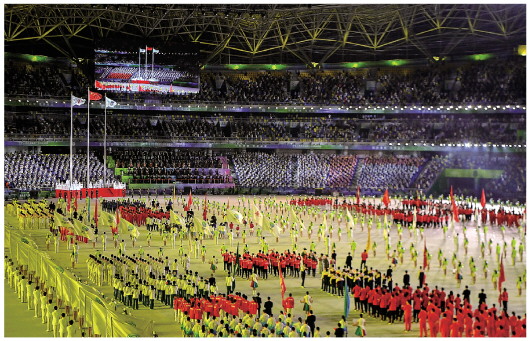 圣火映衬下,开幕式在主题歌《跨越》中渐近尾声。夜幕下的西安奥体中心体育场,像一朵石榴花一样,绽放在灞河之滨。