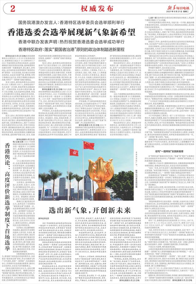 《香港商报》发表时评认为,新选制下成功选出的选举委员会,全面落实“爱国者治港”原则,符合均衡参与和广泛代表性,体现“一国两制”、为民谋福的初心,对香港开启良政善治新篇章,推动社会由乱转治、由治及兴具有重要意义。