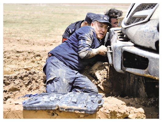 在前往可可西里卓乃湖保护站途中,三江源国家公园管理局长江源园区可可西里管理处巡山队的队员们在修理车辆(2020年7月6日摄)。 新华社记者张龙摄