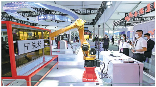 9月25日,在中关村论坛展览(科博会)现场,工作人员展示远程协作机器人的操作。