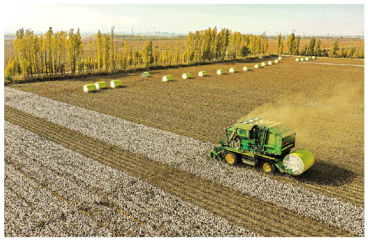 在新疆玛纳斯县乐土驿镇文家庄村,一台采棉机在棉田里采收棉花(2020年10月17日摄,无人机照片)。