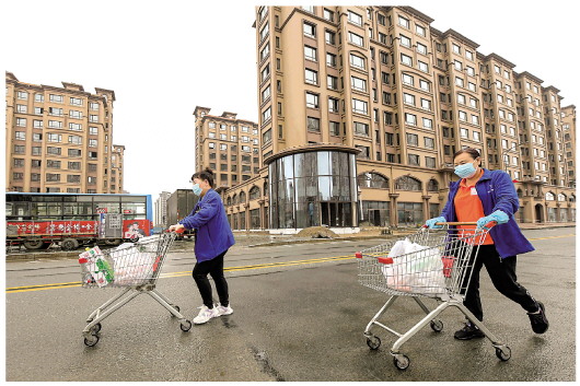 9月27日,在哈尔滨市巴彦县,一大型超市工作人员为封控区居民配送生活物资。