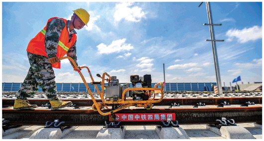 9月27日,中铁四局工人在京唐城际铁路铺轨现场作业。当日,中铁四局工作人员驾驶铺轨机在京(北京)唐(唐山)城际铁路施工现场开始进行长轨铺设,标志着京唐城际铁路进入铺轨阶段。京唐城际铁路起点位于北京市通州区的城市副中心站,终点位于河北省唐山市唐山站,线路长约148.74公里,最高设计时速为350公里。 新华社记者牟宇摄