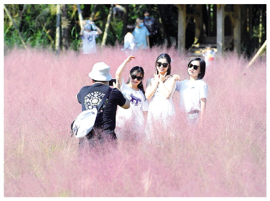 10月2日,在重庆市武隆区仙女山镇懒坝大地艺术景区,游客在粉黛乱子草丛中拍照留念。新华社记者唐奕摄