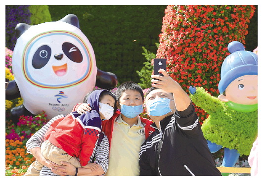 10月1日,人们在北京长安街西单路口“喜迎冬奥”主题花坛前拍照留影。 新华社记者李贺摄 |