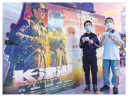 10月1日,在昆明一家电影院,观众在电影《长津湖》展板前合影。