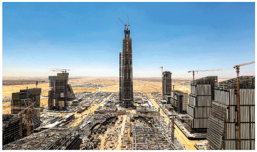 由中建埃及承建的埃及新首都中央商务区项目位于开罗以东约50公里处,总占地面积约50.5万平方米,包含20个高层建筑单体及配套市政工程。中建埃及总经理常伟才说,项目高峰期有9000多名中埃员工在这里生产和生活。