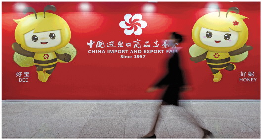 10月9日,一名工作人员走过第130届中国进出口商品交易会吉祥物蜜蜂“好宝