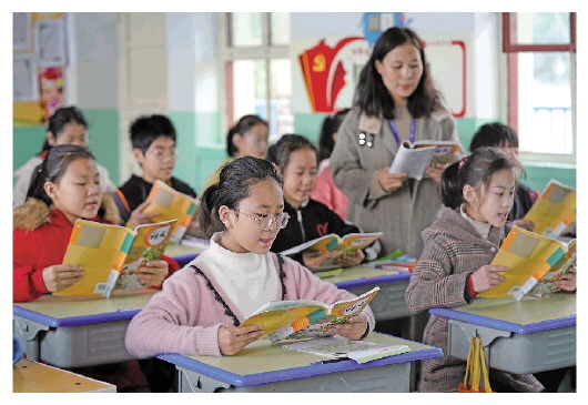 10月11日,在吴璧小学安置点,荆平村的孩子跟着老师朗读课文。