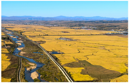 近日,吉林省延边朝鲜族自治州进入水稻收获季,海兰江边水稻金黄,在田野间静待秋收。 新华社记者颜麟蕴摄
