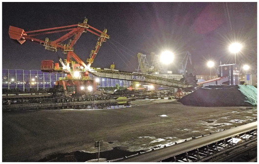 夜晚的天津港煤码头灯火通明,总长度达十七公里的输煤皮带持续运行,电煤船舶停靠在码头进行装船作业。作为中国众多燃煤电厂的煤炭中转站,天津港煤码头正积极抢装、抢运电煤。 新华社记者赵子硕摄