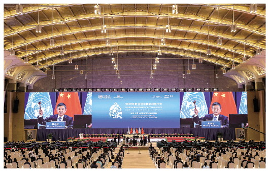 图为10月13日,2020年联合国生物多样性大会(第一阶段)高级别会议在云南昆明闭幕,会议正式通过“昆明宣言”,呼吁各方采取行动,共建地球生命共同体。新华社记者金立旺摄 |