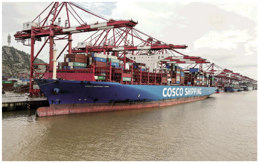 10月13日,中远海运“天秤座”轮停泊在上海洋山港二期码头(无人机照片)。