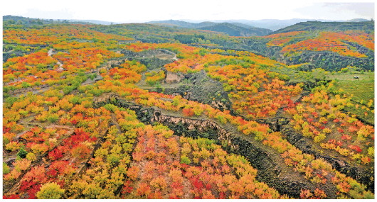 10月14日拍摄的榆林市榆阳区古塔镇韩家梁村杏林红叶(无人机照片)。近日,陕西省榆林市榆阳区南部山区16万亩大扁杏红叶如霞,蔚为壮观。 新华社记者陶明摄