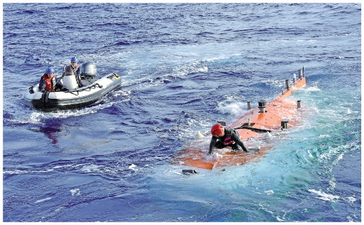 潜水器完成作业上浮后,水手们早已驾着小艇,在海面搜寻和迎接。有时风高浪急,小艇在水面翻腾,来回巡视,这样的场景,像是在戈壁滩上搜寻航天器返回舱一样。