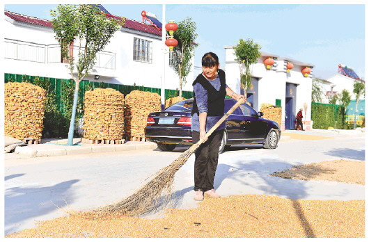 山东菏泽东明县尚庄社区居民在晾晒玉米(10月12日摄)。新华社记者郭绪雷摄 |