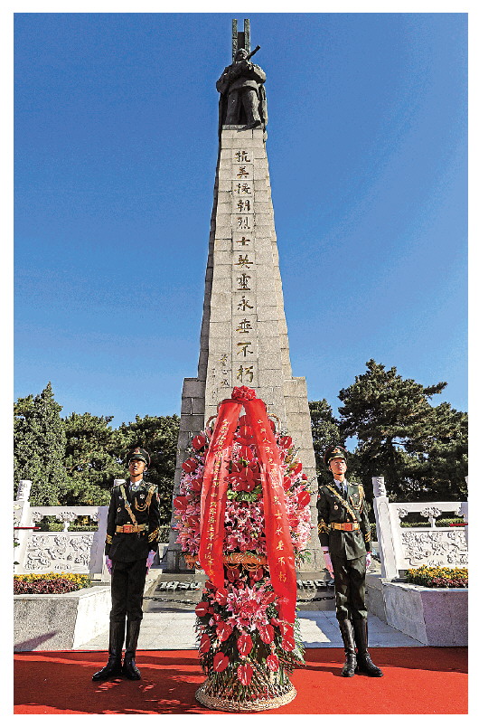右图:这是在辽宁沈阳抗美援朝烈士陵园举行的敬献花篮仪式(2020年10月23日摄)。新华社发