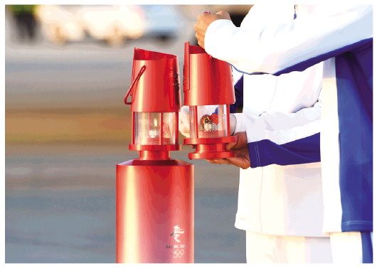 十月二十日,在北京首都机场,护卫人员用引火棒在带回的火种灯中取火,并引燃另一名护卫人员手持的新火种灯。 新华社记者张晨霖摄