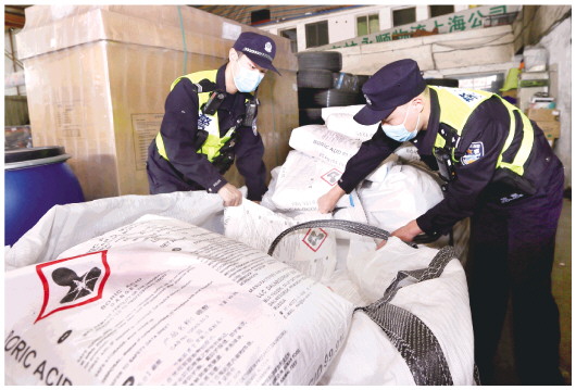 10月24日,上海市公安局嘉定分局民警在一物流园仓库内查获非法储存的危险品。