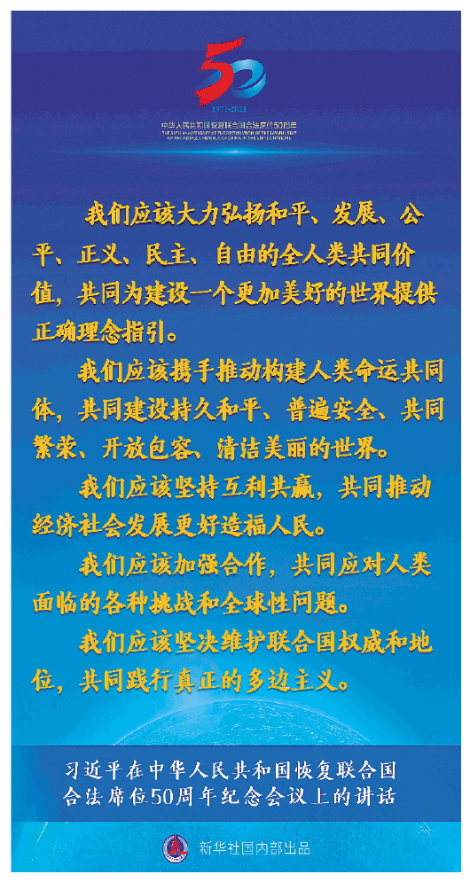在恢复联合国合法席位50周年这个具有特殊意义的历史时刻,以“共同”超越分歧、以“共同”凝聚力量,传递着站在历史正确的一边、人类进步的一边的大国担当,展现出走向伟大复兴的中华民族“为世界谋大同”的历史自觉。 主笔:温馨、杨依军