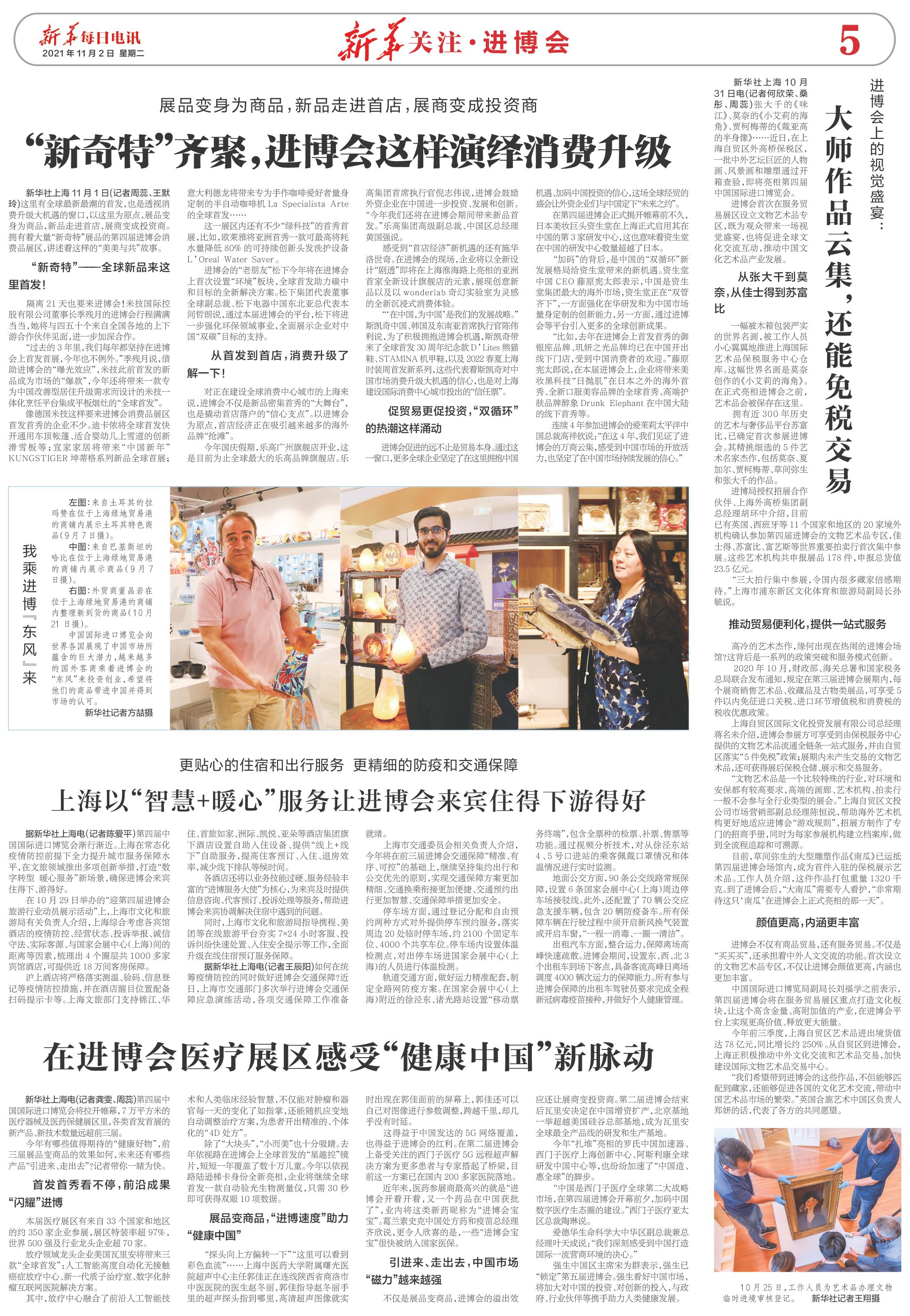 新华社上海11月1日(记者周蕊、王默玲)这里有全球最新最潮的首发,也是透视消费升级大机遇的窗口,以这里为原点,展品变身为商品,新品走进首店,展商变成投资商。拥有着大量“新奇特”展品的第四届进博会消费品展区,讲述着这样的“美美与共”故事。