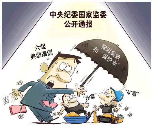 新华社北京11月2日电日前,中央纪委国家监委对6起“沙霸”“矿霸”背后腐败和“保护伞”典型案例进行公开通报,具体如下: