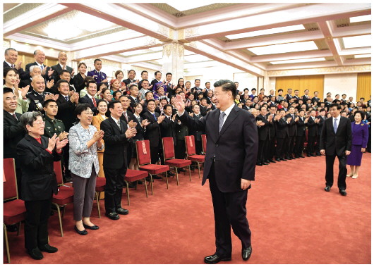上午11时,习近平等来到人民大会堂北大厅,全场响起热烈掌声。习近平等走到代表们中间,同大家亲切交流并合影留念。