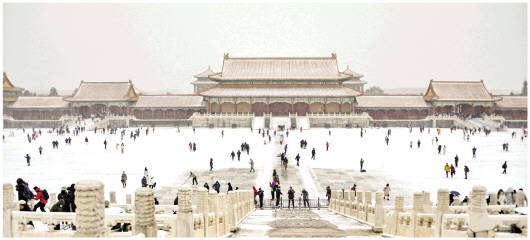 11月7日,游人在雪中游览故宫。11月6日起,受寒潮影响,北京出现持续降雪,掩映在雪中的故宫博物院别有韵味。 新华社记者李欣摄 |
