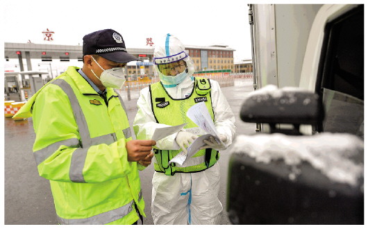 11月6日,宁夏银川市兴庆区交警一大队协警(右)与高速公路工作人员在高速公路收费站对过往车辆进行检查。 新华社记者王鹏摄