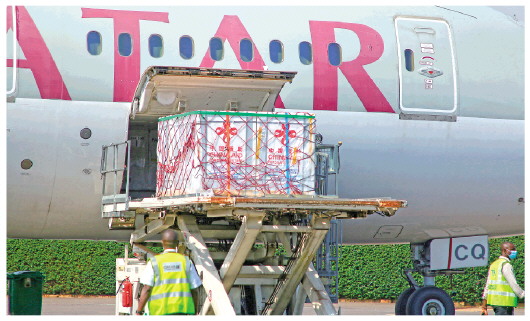 11月7日,工作人员在卢旺达首都基加利国际机场卸载中国援助的新冠疫苗。新华社记者吉莉摄