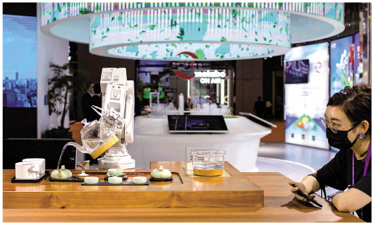 11月7日,在第四届进博会技术装备展区,一款泡茶机器人在进行现场演示。
