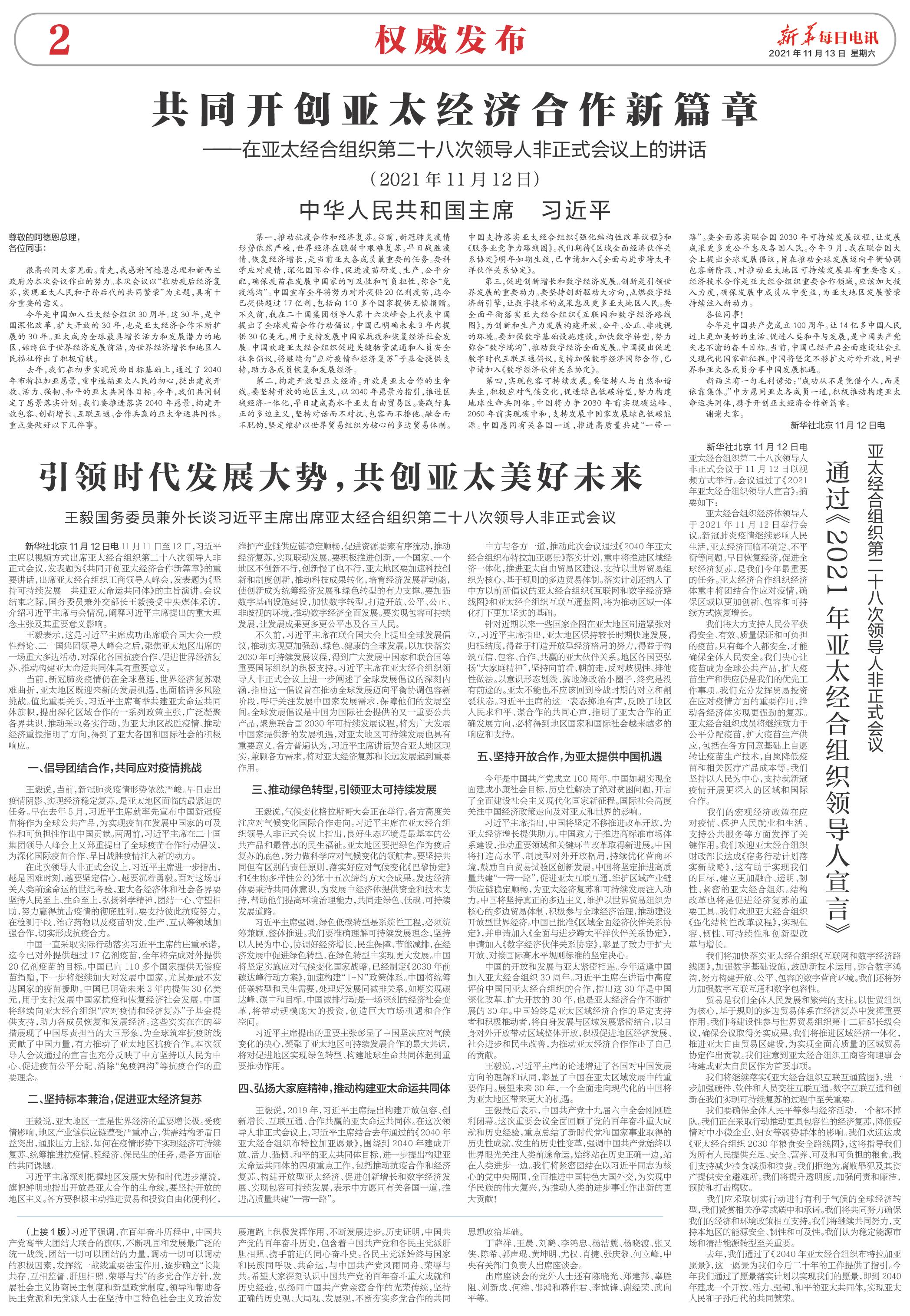 亚太经合组织经济体领导人于2021年11月12日举行会议。新冠肺炎疫情继续影响人民生活,亚太经济面临不确定、不平衡等问题。早日恢复经济,促进全球经济复苏,是我们今年最重要的任务。亚太经济合作组织经济体重申将团结合作应对疫情,确保区域以更加创新、包容和可持续方式恢复增长。