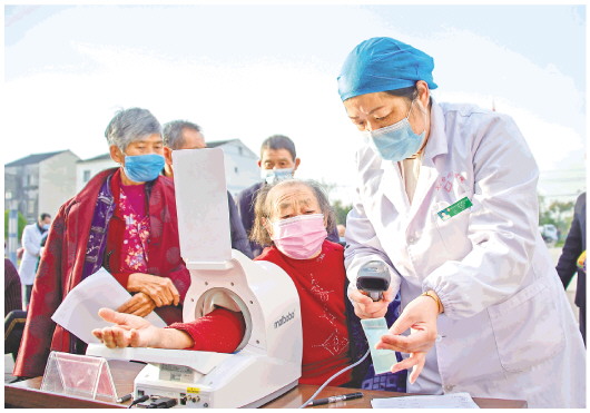 近日,湖北省枝江市基层移动医疗卫生服务车驶入枝江市七星台镇,为居民提供多项健康筛查。据了解,基层移动医疗卫生服务车上配备有全自动生化分析仪、便携式彩超诊断仪、全自动尿液分析仪等设备,可开展血常规、尿常规、血糖血脂、心电图等检验项目。图为医务人员为居民测量血压。 新华社发(伍志尊摄)