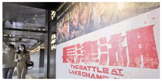 在香港尖沙咀一家电影院,电影《长津湖》的广告板摆放在影院的显著位置(11月15日摄)。