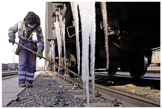 11月21日,在鸡西站西场,工作人员在车辆进站后固定车体。黑龙江各地各部门积极准备,应对即将到来的极端天气。 新华社记者张涛摄 |