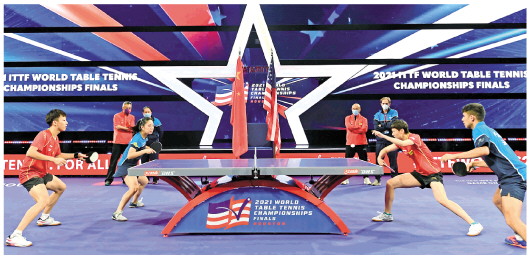 休斯敦世乒赛主赛场内,一号球台摆在正中央,两端的混双选手球衣一红一蓝,画面既新鲜又和谐。