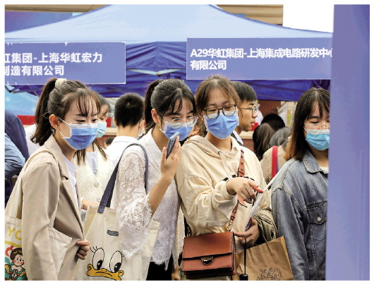 毕业生在2022届上海高校毕业生秋季校园招聘会上了解岗位信息(10月12日摄)。