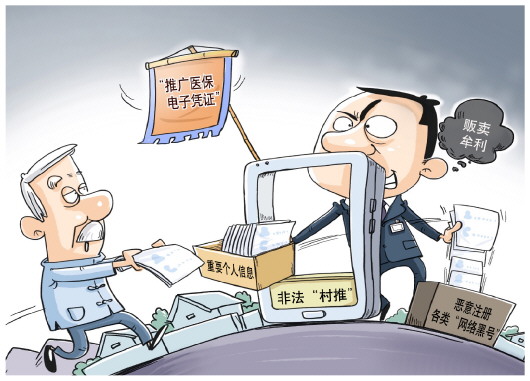 近年来,为进一步提升医保公共服务水平,全国各地大力推广医保电子凭证。一些不法分子却借机动起歪脑筋,以“推广医保电子凭证”为幌子,在农村进行非法“村推”,获取群众身份证号、手机号等重要个人信息,进而恶意注册各类“网络黑号”并贩卖牟利。对这类不法行为,需及时打击,铲除其生存空间。